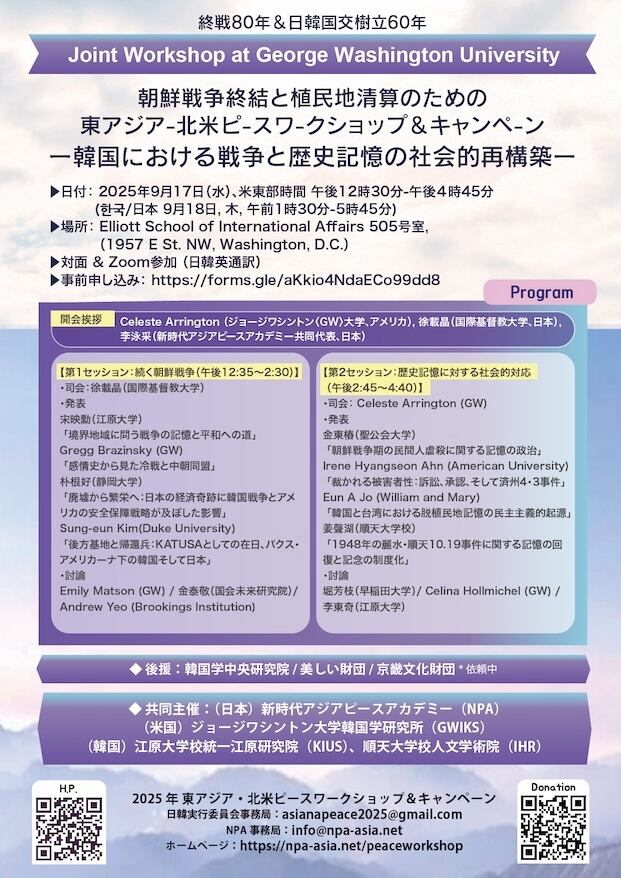 NPAは、コース3「朝鮮戦争と日本」講座の成果を踏まえ、長年にわたり連携してきた日韓の研究者および市民団体とともに、北米の研究者・市民団体の協力を得て、2025年9月15日から19日にかけて、以下の共同ピースワークショップおよびキャンペーンを企画しました。