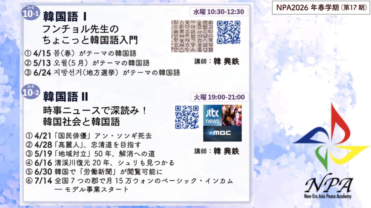 概要:第1回は、「봄(春)」の訪れを感じながら春にまつわる韓国語を学びます。황사(黄砂)や벚꽃(桜)など、季節や天気に関連する単語に加え、「시작하다(始まる)」を使った表現にもチャレンジします。さらには、短い会話練習を通して身近な春の出来事を韓国語で表現できる力を身につけます。
