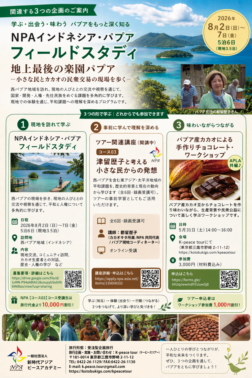 講師プロフィール:1960年生。新時代アジアピースアカデミー (NPA)共同代表、カカオキタ社アドバイザー、インドネシア・パプア州ジャヤプラ在住。1994年、村井吉敬先生の現地を歩いて学ぶフィールドスタディにお供し、パプア先住民族に出会う。そこからパプアの政治・社会運動、経済活動に関心を持ち、2012年から日本の消費者をパートナーとするカカオ民衆交易をパプア先住民族の人びとと共に取り組み現在に至る。