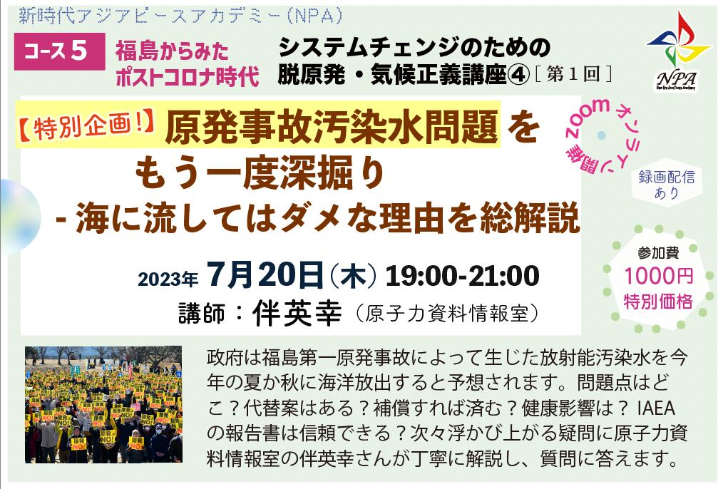 概要:政府は福島第一原発事故によって生じた放射能汚染水を今年の夏か秋に海洋放出すると予想されます。問題点はどこ?代替案はある?補償すれば済む?健康影響は?IAEAの報告書は信頼できる?次々浮かび上がる疑問に原子力資料情報室の伴英幸さんが丁寧に解説し、質問に答えます。