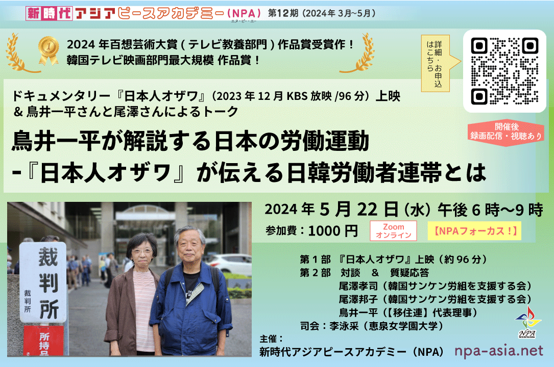 日韓市民・労働者連帯を実践してきた『日本人オザワ』をしっていますか。NPAコース11「鳥井一平が解説する日本の労働運動」では、日本企業が海外進出先韓国で起こした労働争議問題に対して、当該労働者の日本への「遠征」をサポートし、日本企業との交渉や追及行動に連帯してきた『日本人オザワ』の姿から、日韓市民・労働者連帯のあり方を考えます。第1部では、ドキュメンタリー映像『日本人オザワ』(96分)を上映し、第2部では、尾澤さんのトークと討論を行います。